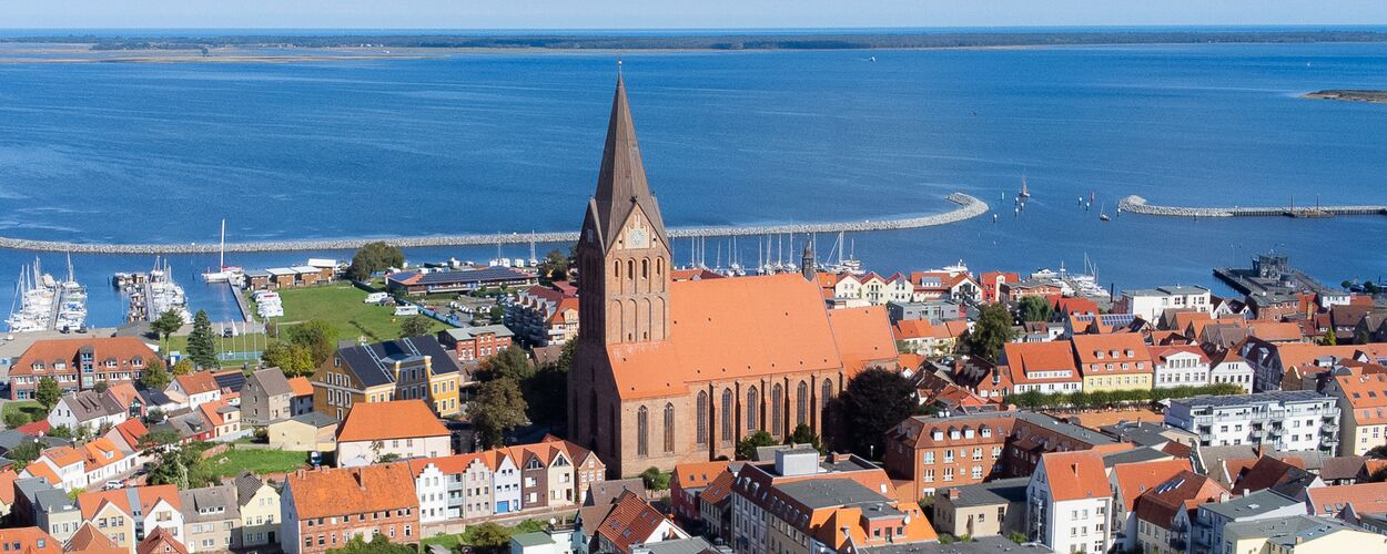 Bei einem Besuch der Kirche sollten Sie auch den Turm besteigen. Beim Aufstieg können Sie die Gewölbe von oben betrachten, einen Blick auf den beeindruckenden Dachstuhl werfen und die Glocken bestaunen. Nach 180 Stufen erreichen Sie in 55 m Höhe eine Plattform, von der aus Ihnen Fensteröffnungen zu allen Seiten eine fantastische Aussicht über Barth, auf den Bodden und die Halbinsel Fischland-Darß-Zingst und das Umland bieten.